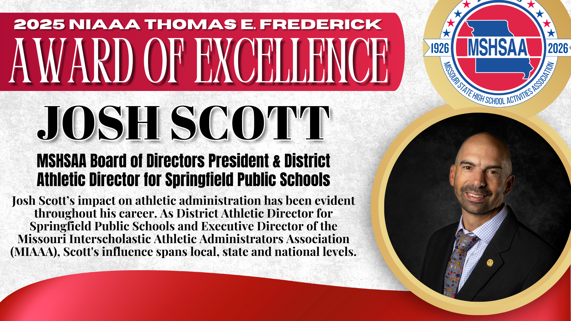 TAMPA, Fla. – The Missouri State High School Activities Association (MSHSAA) is proud to recognize Josh Scott, CMAA, MSHSAA Board of Directors President and District Athletic Director for Springfield Public Schools, for being named the 2025 recipient of the National Interscholastic Athletic Administrators Association (NIAAA) Thomas E. Frederick Award of Excellence.