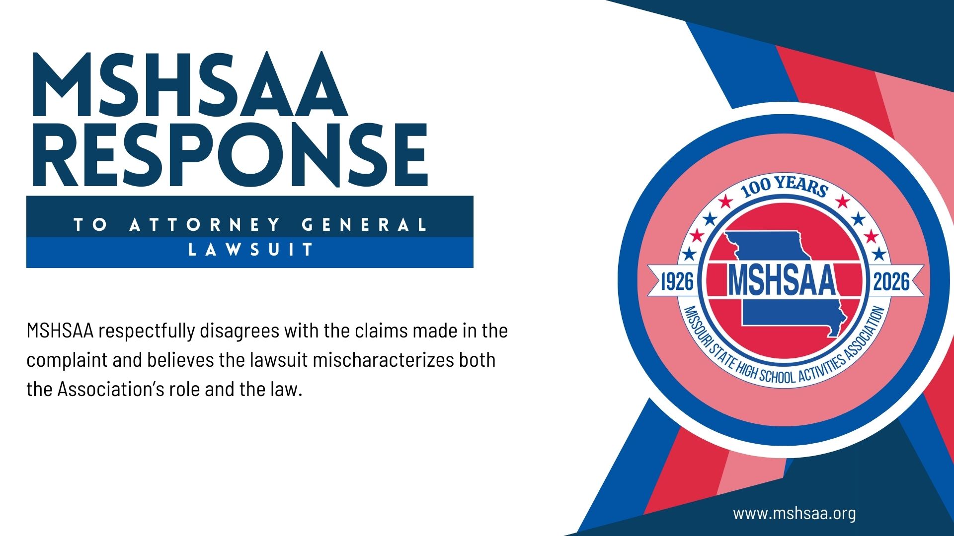 MSHSAA respectfully disagrees with the claims made in the complaint and believes the lawsuit mischaracterizes both the Association’s role and the law. Because this matter is now pending before the court, MSHSAA will not litigate it in the press.